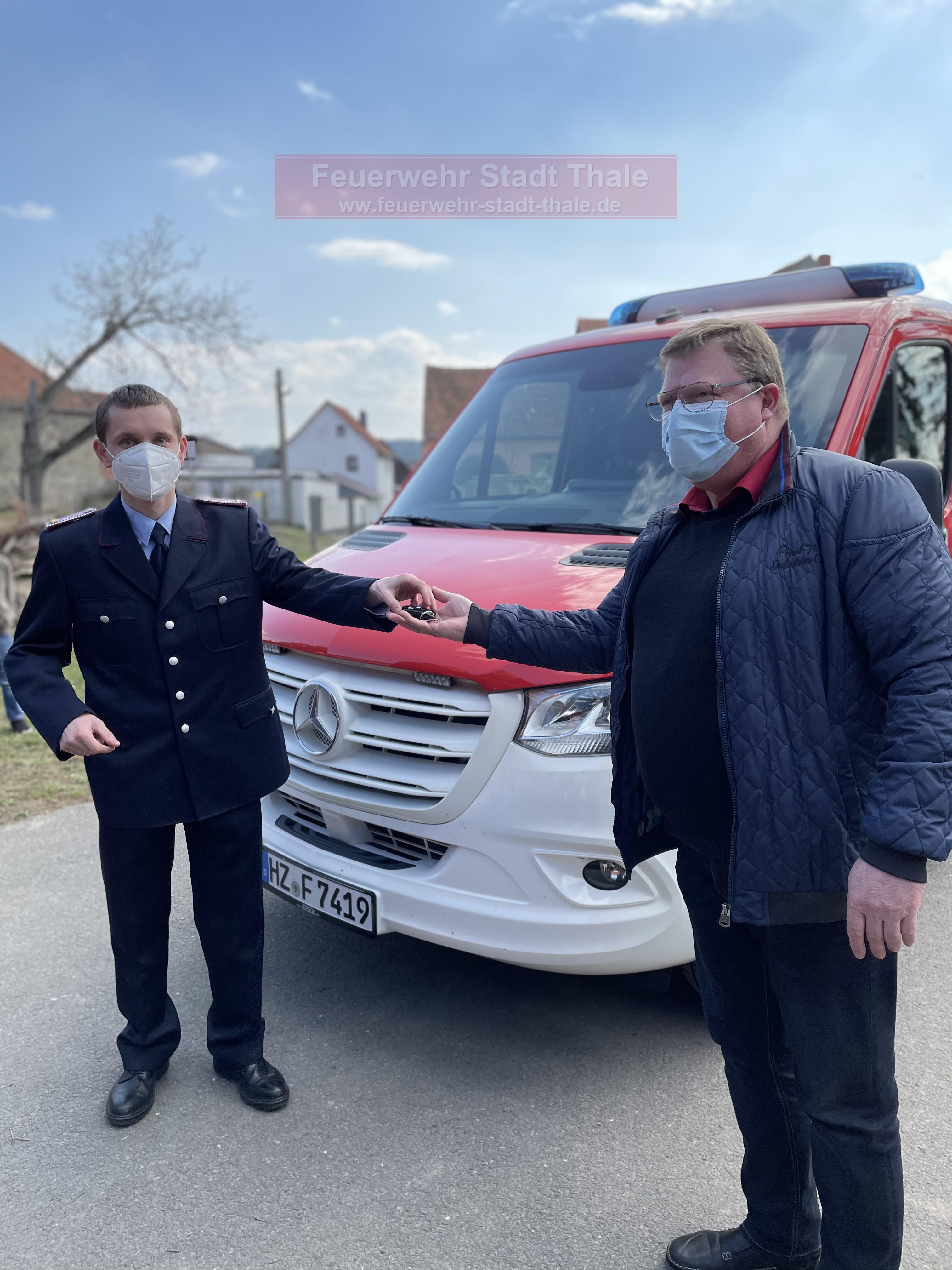 Ortswehrleiter Torsten Bothe konnte vom amtierenden Bürgermeister der Stadt Thale, Frank Hirschelmann, den Schlüssel für das neue Fahrzeug entgegen nehmen.