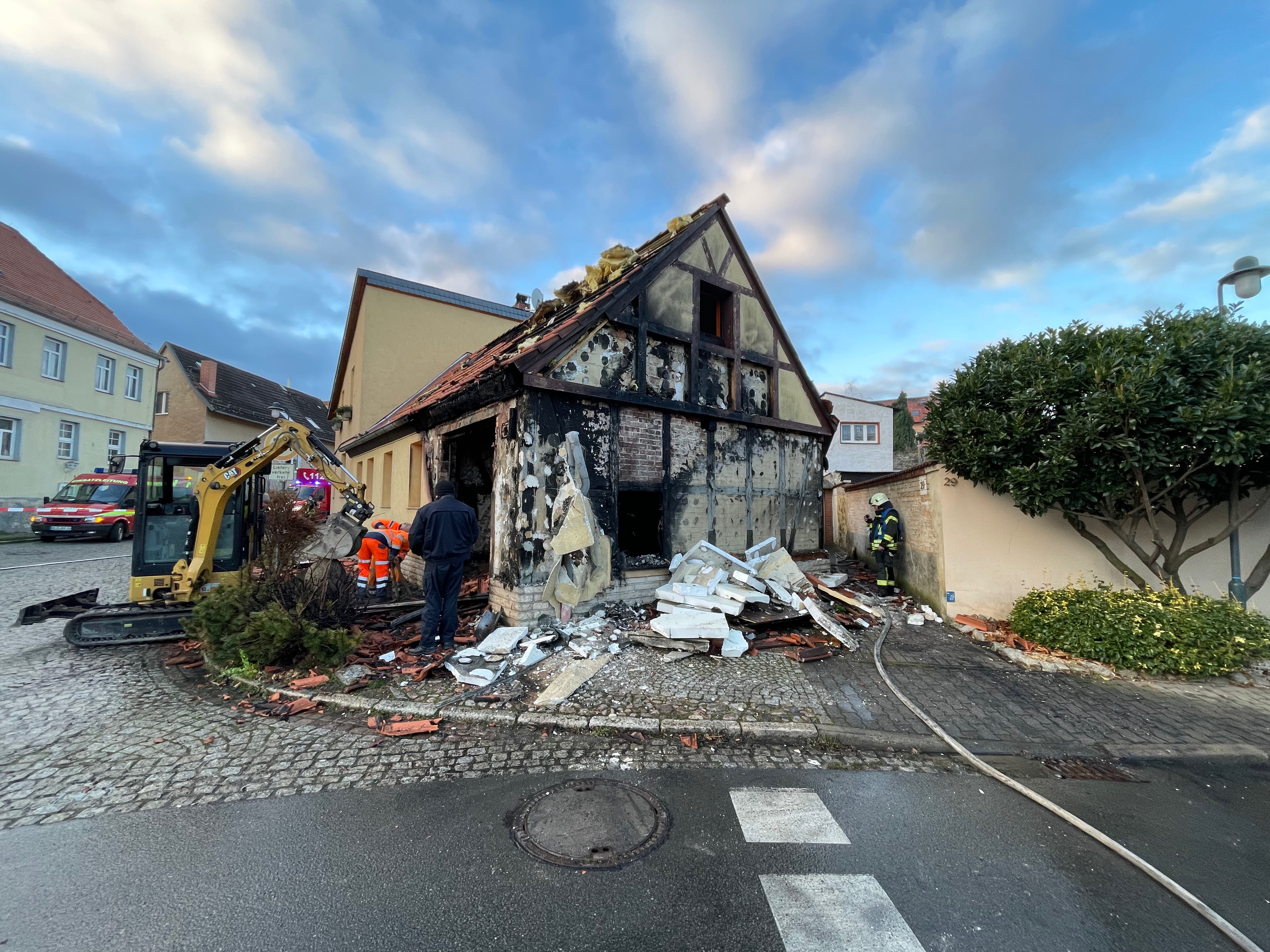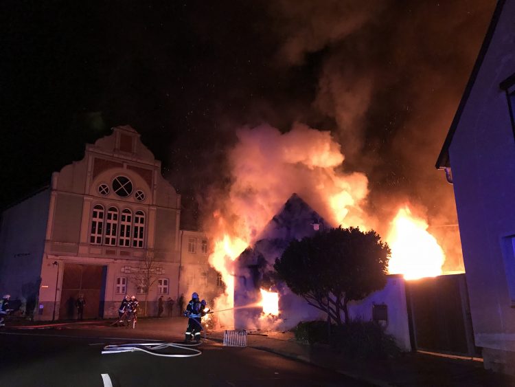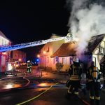 Bereits beim Eintreffen der ersten Kameraden stand das Haus in Vollbrand, sofort wurde von den ersten Kameraden mit dem Löschangriff von außen begonnen. Zu diesem Zeitpunkt stand bereits fest, dass sich glücklicherweise kein Bewohner mehr im Haus befand, die Bewohnerin konnte unverletzt das Haus rechtzeitig verlassen. Auch anliegende Nachbarn konnten gewarnt und evakuiert werden. Umgehend wurde weiterhin die Löschwasserversorgung über Hydranten und eine Riegelstellung aufgebaut. Somit konnte das Wohnhaus von mehreren Seiten aus gelöscht werden. Dafür waren zwischenzeitlich insgesamt acht Trupps unter schwerem Atemschutz im Einsatz. Zudem wurde eine Brandbekämpfung von der Drehleiter aus vorgenommen.