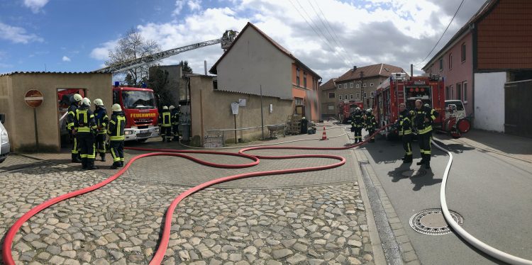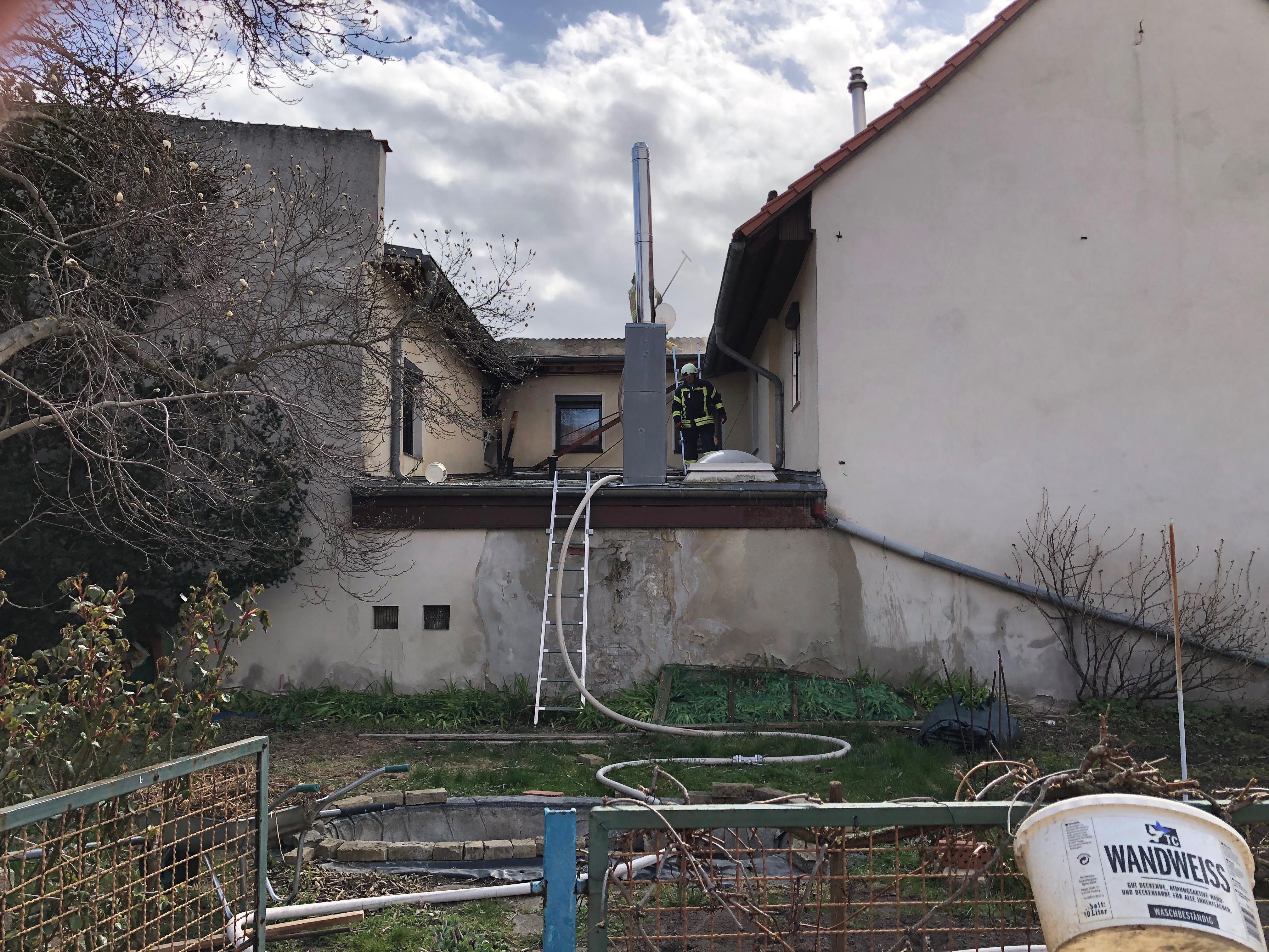 Vor Ort kam es aus bisher unbekannter Ursache zu einem Brand in einem Nebengebäude, welches drohte durch eine Zwischendecke auf das Wohngebäude überzugreifen. Die Kameraden gingen unter schwerem Atemschutz zur Brandbekämpfung vor, zeitgleich wurde eine stabile Löschwasserversorgung von einem Hydranten aufgebaut und die Drehleiter in Stellung sowie zum Einsatz gebracht. Weitere Kameraden gingen über die Steckleiter zum Außenangriff vor.
