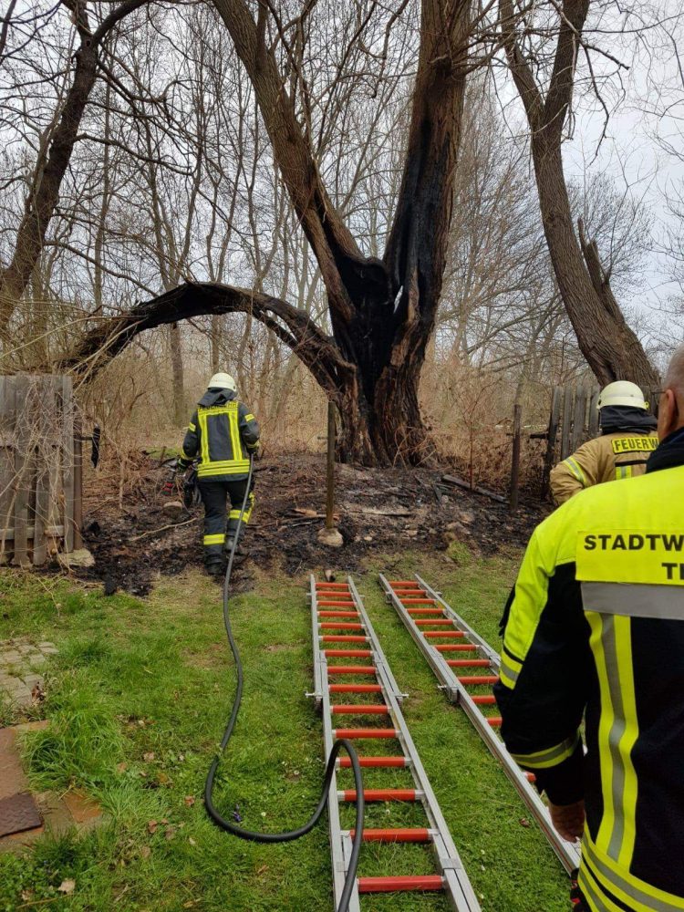 Der zweite Einsatz der Ortsfeuerwehr Thale an diesem Wochenende führte uns zu einem Baumbrand in die Neinstedter Straße. Aus unbekannter Ursache kam es zu einem Brand an einem Baum. Da dieser bereits innen hohl war, konnte das Feuer schnell eindringen. Wir löschten den Brand und mussten Teile des Baumes fällen. Nach drei Stunden konnten wir unseren Einsatz beenden.