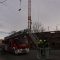 Die Leitern hingen stark im Wind, zur Gefahrenabwehr wurden diese dann mittels Einsatz der Drehleiter abgehängt.