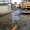 Eine provisorische Verrohrung einer Baustelle wurde durch Starkregen zugesetzt , das Rohr wurde aufgetrieben und die Wassermengen überfluteten den Baustellenbereich, die Fahrbahn und angrenzende Grundstücke.