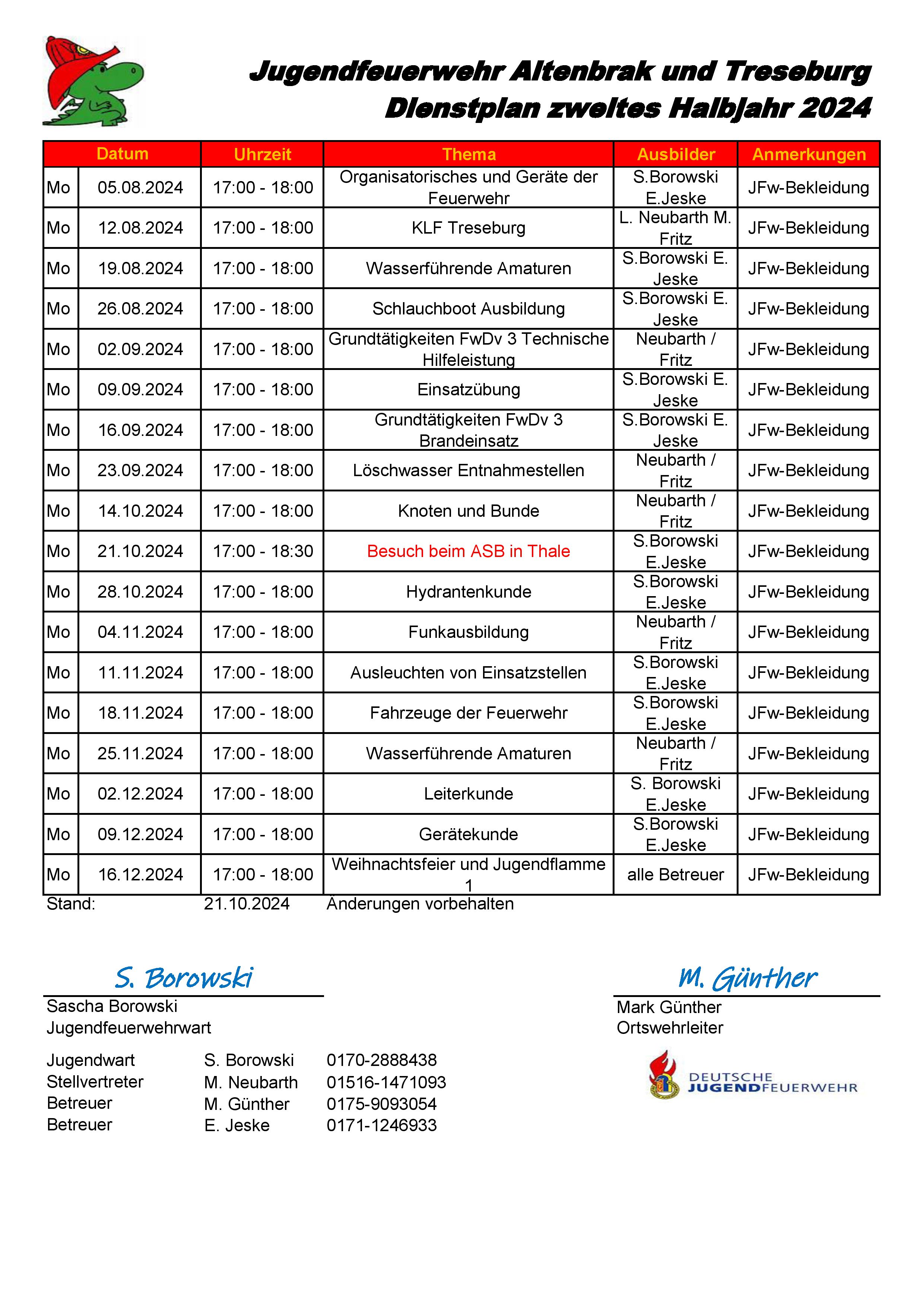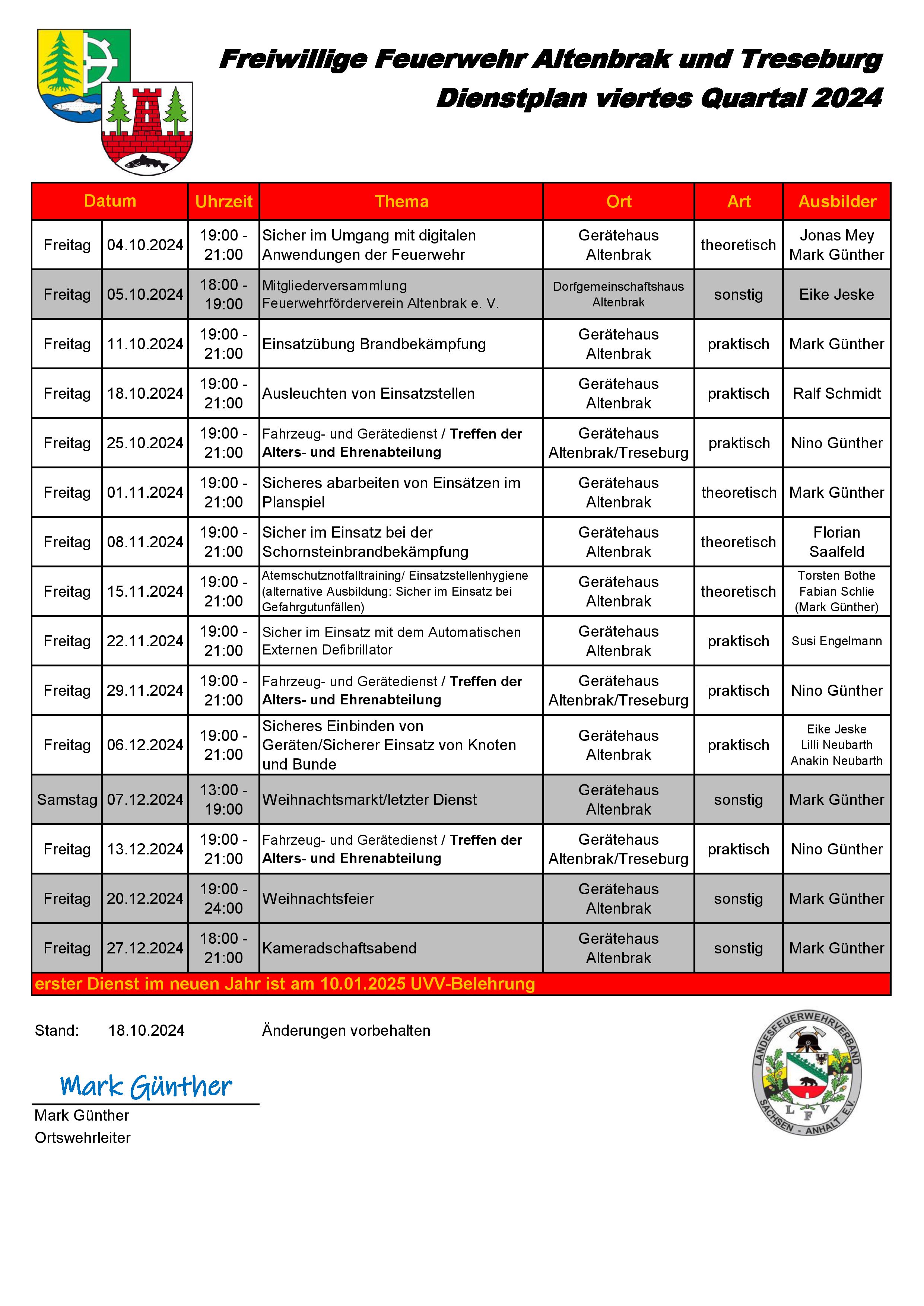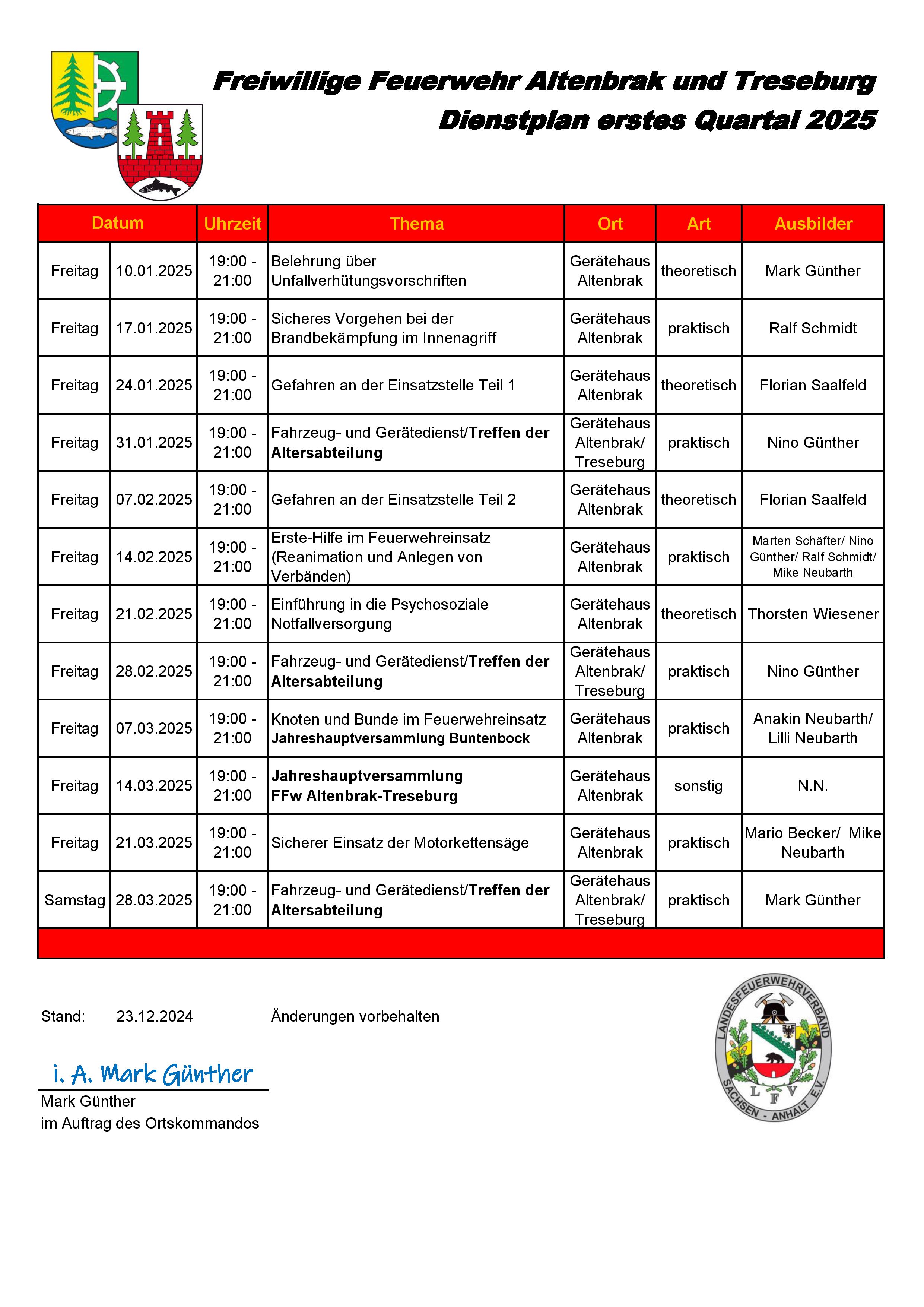Altenbrak – Freitag – 17:00 – 19:00 Uhr Dienstplan JFW Altenbrak-Treseburg