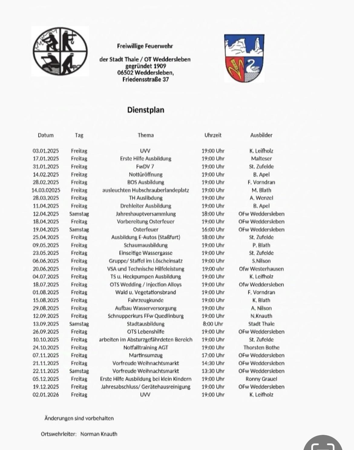 Weddersleben – Freitag – 18:30 – 20:30 Uhr Dienstplan Weddersleben