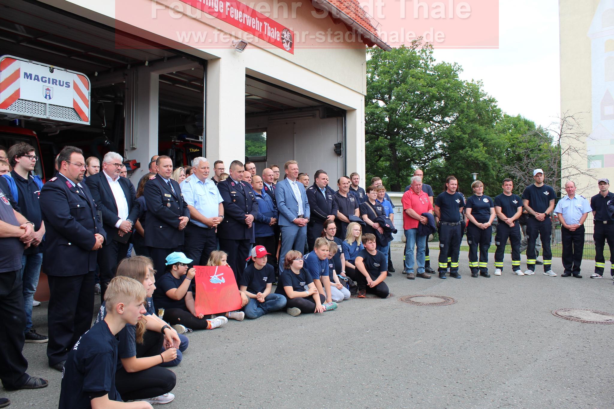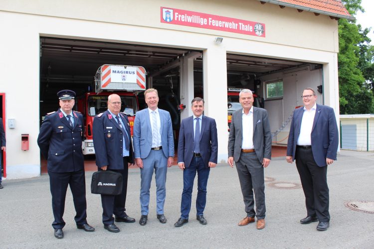 Auf dem Titelbild sind zu sehen: Detlef Goerecke (Ortswehrleiter Thale), Rainer Braune (Stadtwehrleiter Feuerwehr Stadt Thale), Ulrich Thomas (MdL), Thomas Balcerowski (Bürgermeister Stadt Thale), Holger Stahlknecht (Innenminister), Heiko Breithaupt (Bürgermeister Stadt Blankenburg) (v.l.n.r.)