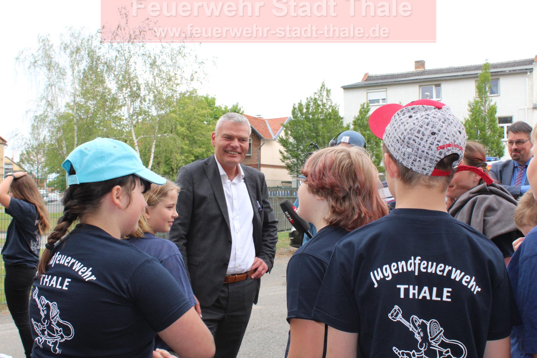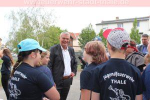 Im Nachgang bedankte sich der Innenminister im Gerätehaus der Ortsfeuerwehr Thale bei den anwesenden Kameradinnen und Kameraden für Ihren geleisteten Einsatz bei dem Brand an der Roßtrappe. Auch Stadtwehrleiter Rainer Braune und Bürgermeister Thomas Balcerowski drückten Ihren Dank und Anerkennung für die Einsatzbereitschaft der Kameradinnen und Kameraden aus und dankten auch stellvertretend den anwesenden Landwirten Christoph Klamroth und Jürgen Baum für die Hilfe mit Ihrer landwirtschaftlichen Technik (Wasserkaupen). Gemeinsam luden Sie zu einer Grillwurst und einem Umtrunk ein. Dabei kam der Innenminister auch mit einzelnen Kameradinnen und Kameraden, Mitgliedern der Jugendfeuerwehr und weiteren Gästen ins Gespräch.