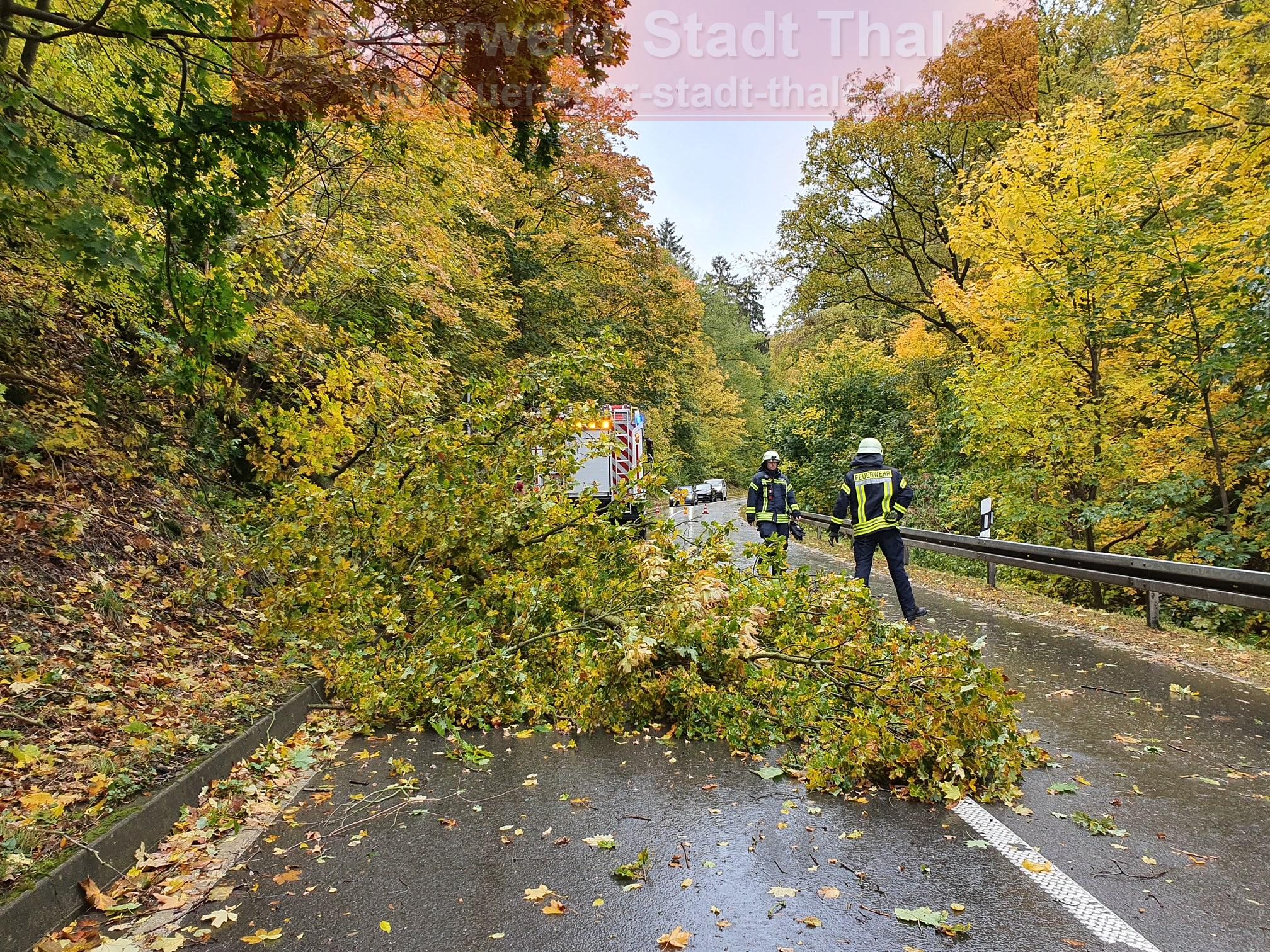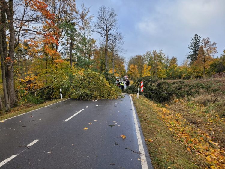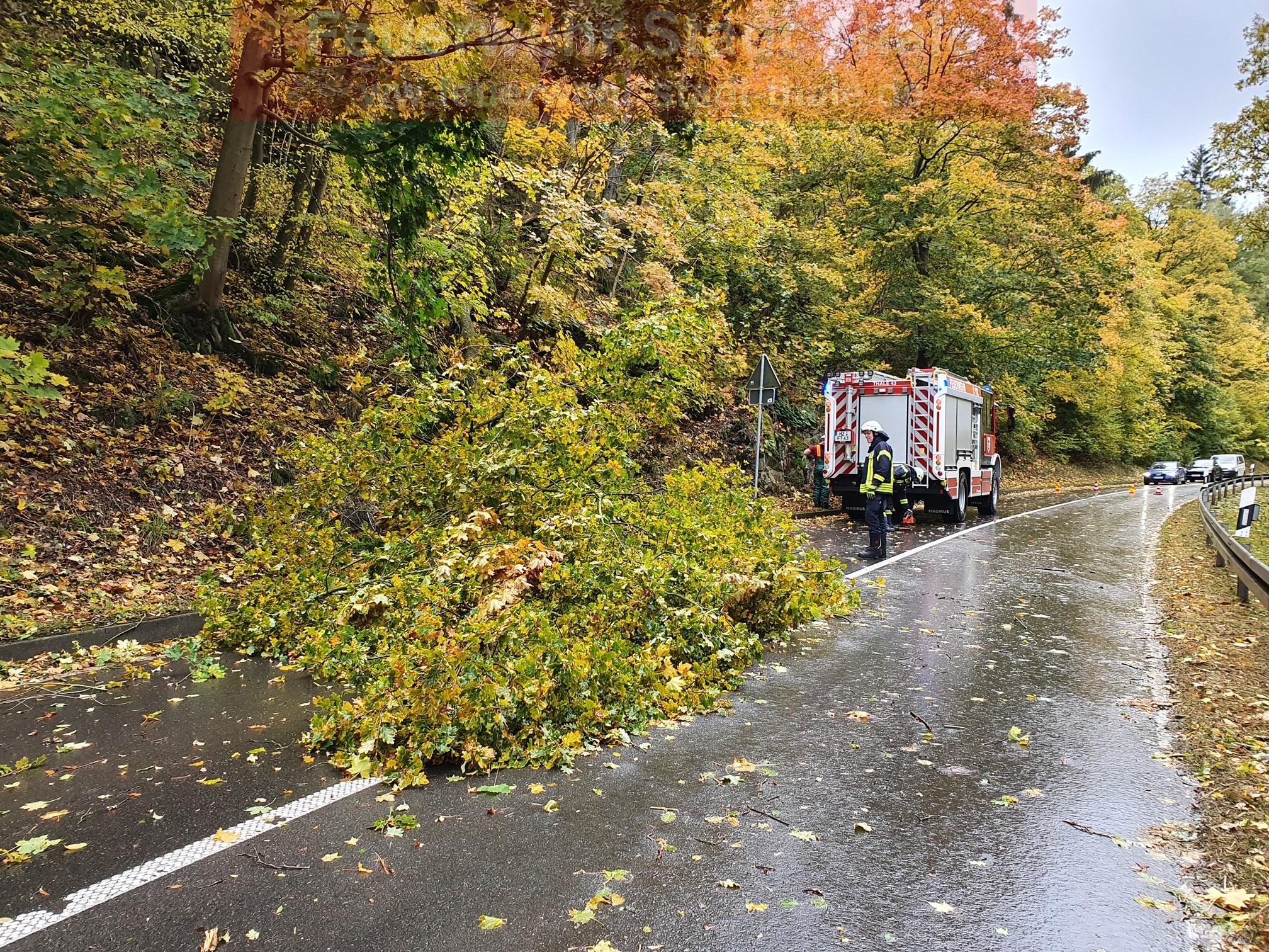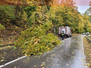 Seit dem Morgen sind verschiedene Ortsfeuerwehren im Einsatz um hauptsächlich umgestürzte Bäume von Straßen zu beseitigen. Dazu zerteilen die Kameraden die Bäume mittels Motorkettensäge und tragen die mittels Manpower von der Straße.