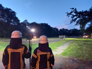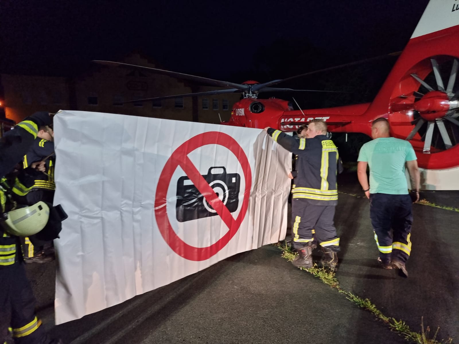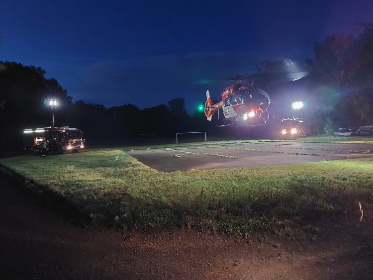 Dazu wurde der Landeplatz ausgeleuchtet und abgesichert. Nach der Landung unterstützten die Feuerwehrkräfte beim Patiententransport zwischen Rettungswage und Rettungshubschrauber.