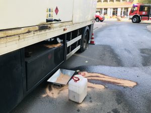 Die Einsatzstelle wurde abgesichert und die betroffenen Stellen mit Bindemittel abgestreut sowie eine Schuttmulde unter der Leckage platziert.