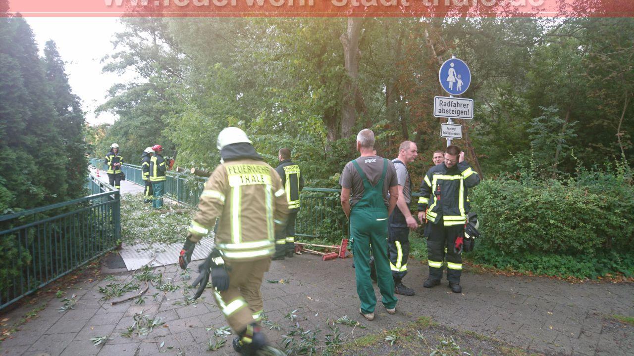 Die Kameraden der Feuerwehr Thale wurden zu einem umgestürtzen Baum auf eine Brücke mit getroffener Freileitung gerufen.