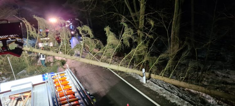 Vor Ort bestätige sich die Lage und der Baum wurde mittels Motorkettensäge zerkleinert und beseitigt.