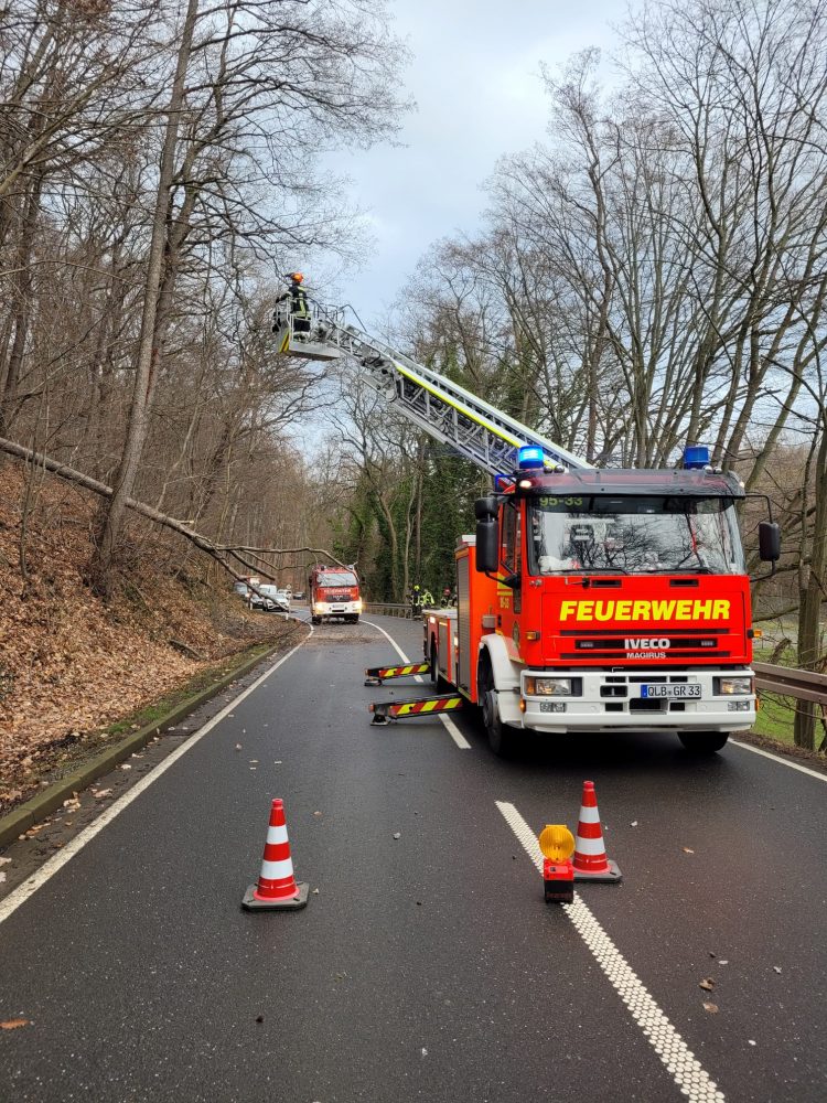 Vor Ort ragte ein Baum auf die Fahrbahn. Dieser wurde von den Einsatzkräften mittels Motorkettensäge unter anderem vom Drehleiterkorb aus entfernt und die Straße anschließend wieder freigegeben.