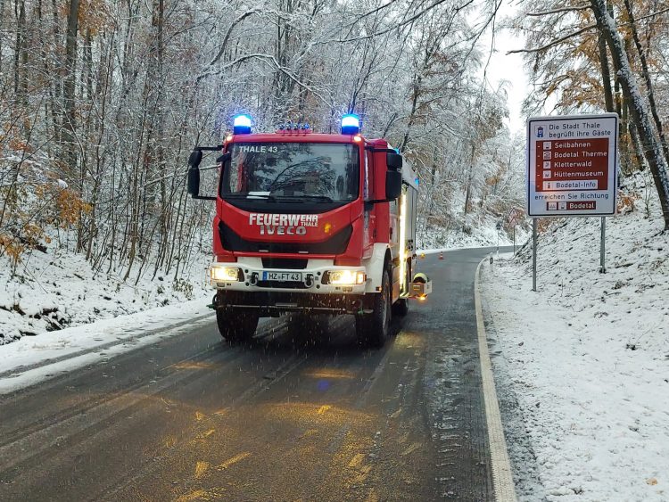 Zweiter Einsatz des Tages für die Ortsfeuerwehr Thale. Ein weiterer umgestürzter Baum versperrte die Fahrbahn Richtung Roßtrappe. Die Einsatzkräfte entfernten den Baum und konnten den Einsatz wenig später beenden.