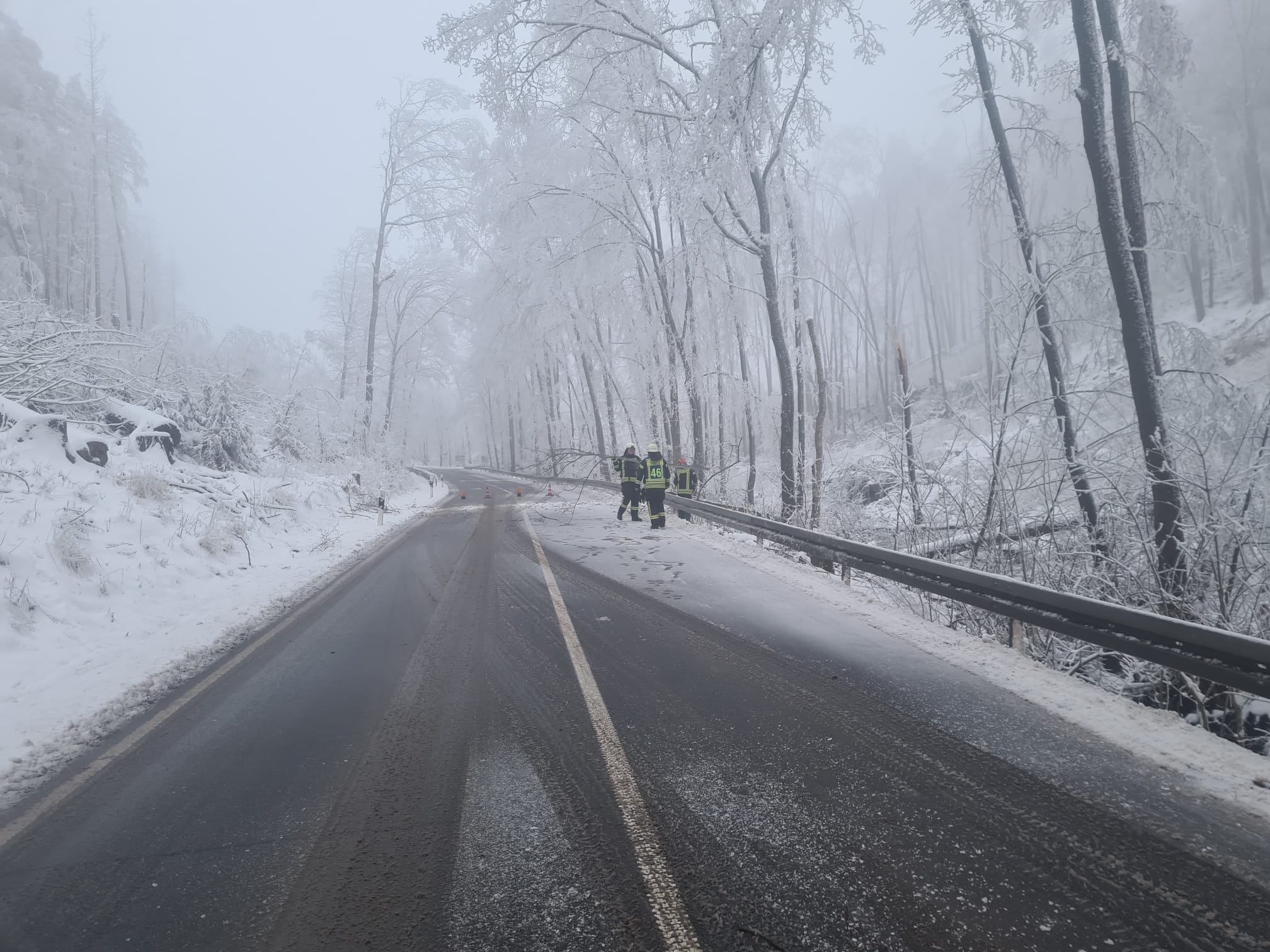 Nachdem bereits die Ortsfeuerwehren aus Friedrichsbrunn und Allrode am Freitagmorgen mehrere Bäume und Äste von der L240 und L93 beseitigt hatten, wurde auch die Ortsfeuerwehr Thale wenig später auf die L240 in Richtung Friedrichsbrunn alarmiert.