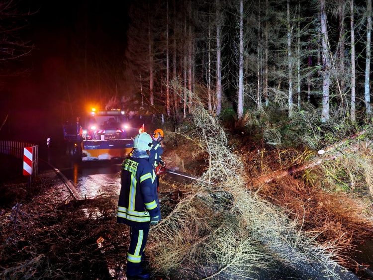 Nach Sicherung der Einsatzstelle wurden die Bäume mittels Motorkettensäge zerkleinert und von der Straße entfernt.