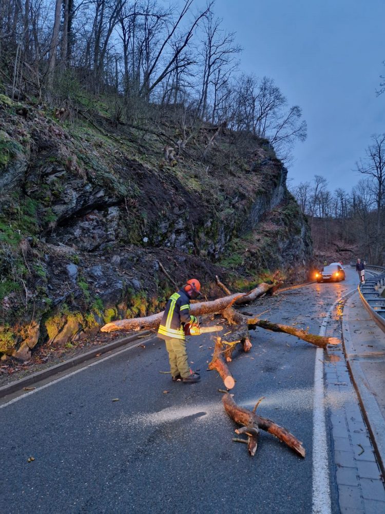 Nach dem Eintreffen an der Einsatzstelle wurde diese zunächst abgesichert. Im Anschluss wurde der Baum unter Verwendung der Motorkettensäge zerkleinert und von der Straße entfernt. Abschließend wurde die Straße von der Verschmutzung befreit und die Strecke konnte wieder ungehindert passiert werden.