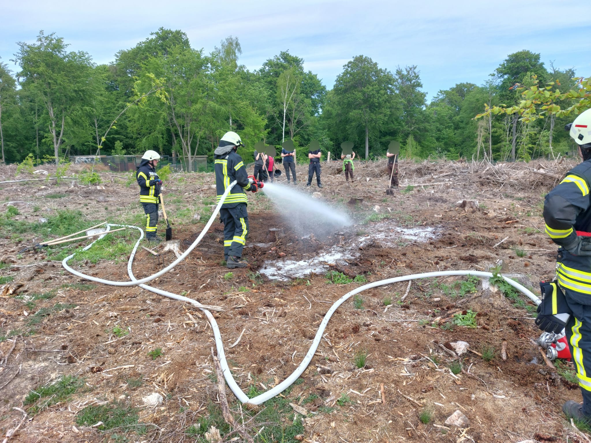 Außerdem leiteten sie die Einsatzkräfte schnellstmöglich zur Einsatzstelle. Die Zuwegung zum Brandherd gestaltete sich schwierig, sodass eine Wasserversorgung mit mehreren B-Schläuchen von den Löschfahrzeugen aus gelegt werden musste. Die Brandbekämpfung wurde zunächst mit einem C-Rohr eingeleitet. Der Brand breitete sich zwischenzeitig unterirdisch und auf einer Fläche von ca. 20 qm aus. Eine weitere Ausbreitung konnte glücklicherweise – nicht zuletzt durch das schnelle Eingreifen der Tierparkmitarbeiter – verhindert werden.