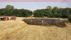 Dort standen ca. 200 qm Ackerfläche in Vollbrand. Dieser wurde durch den Einsatz mehrerer Rohre abgelöscht. Einzelne Brandherde wurde während der dann durchgeführten Nachlöscharbeiten beseitigt. Abschließend wurde die Einsatzstelle an den Eigentümer übergeben.