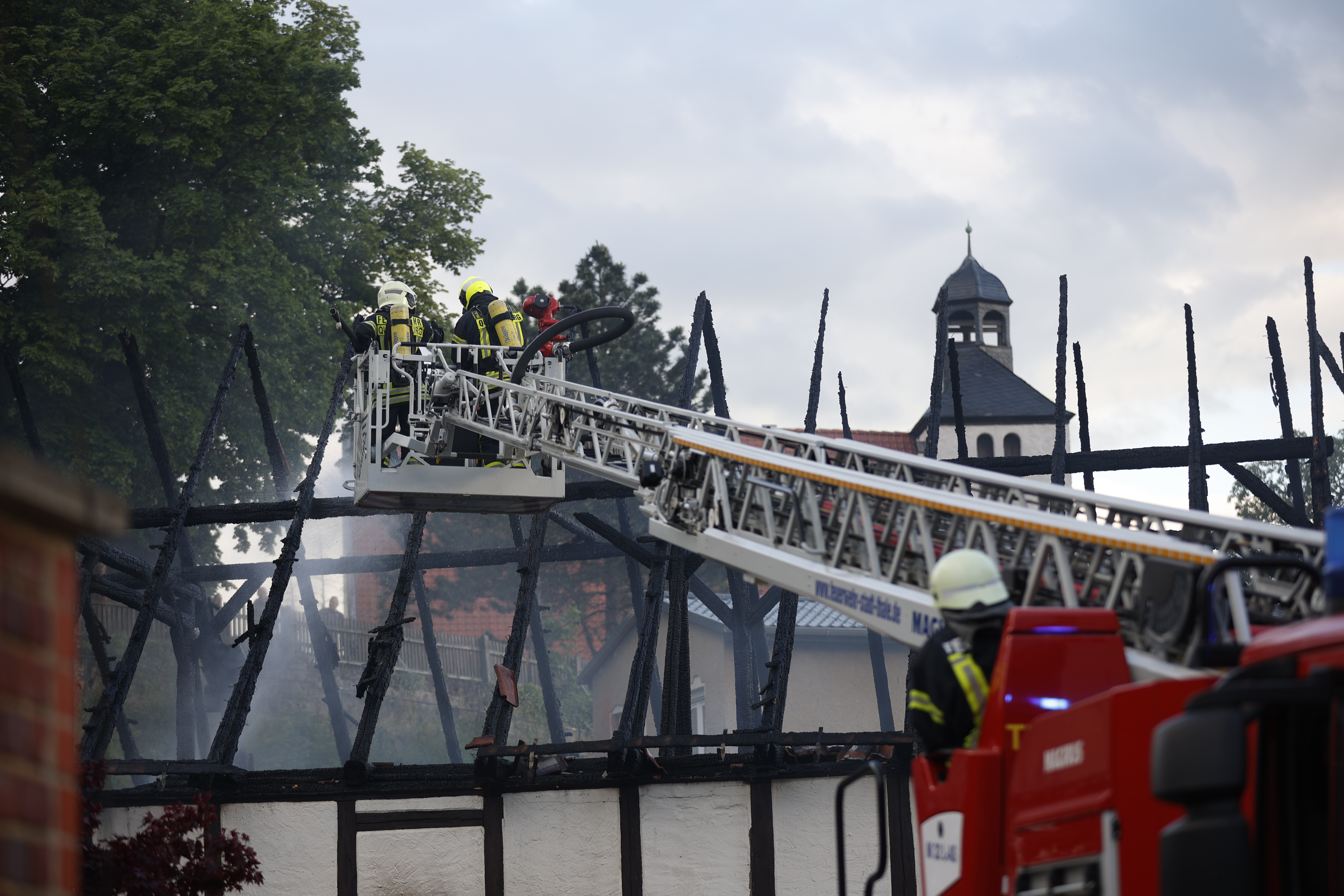 Daraufhin wurden weitere Einsatzkräfte des THW Quedlinburg und Halberstadt mit schwerem Gerät nachalarmiert, die im späteren Einsatzverlauf Sicherungsmaßnahmen am Gebäude vornahmen, über den Drehleiterkorb Dachbalken mittels Motorkettensäge abgetragen sowie einen Giebel eingerissen haben.