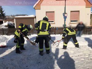 Parallel dazu wurde die Einsatzstelle abgesichert und die Wasserversorgung aufgebaut. Dies gestaltete sich etwas schwierig, da der Hydrant unter Schneemassen verborgen war und nicht freigehalten wurde, somit musste dieser erst freigelegt werden.