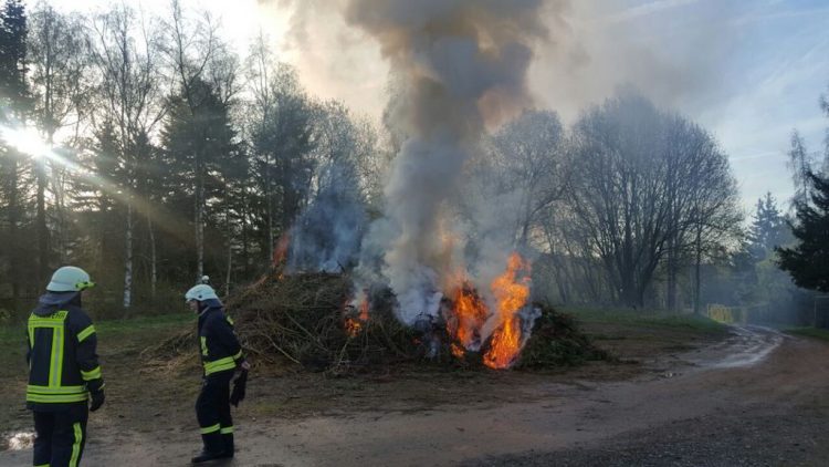 Die Feuerwehr Friedrichsbrunn wurde erneut zu dem in der Nacht brennenden Osterfeuer alarmiert. Diesmal brannte die Übernacht noch gesicherte zweite Hälfte des Feuers.