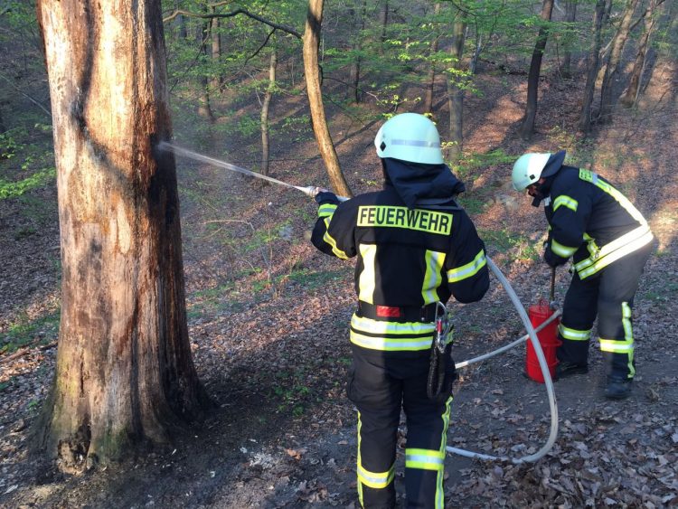 Da dies Einsatzstelle nicht einfach ausfindig zu machen war, wurden die Kameraden durch die Melderin hingeführt. Der brennenden Baumstamm wurde mittels Kübelspritze abgelöscht und anschließend auf die Glutnester leichtes Netzmittel aufgetragen. Anschließend wurde nochmal auf weitere Glutnester kontrolliert, nachdem keine weiteren erkannt wurden, konnte der Einsatz beendet werden.