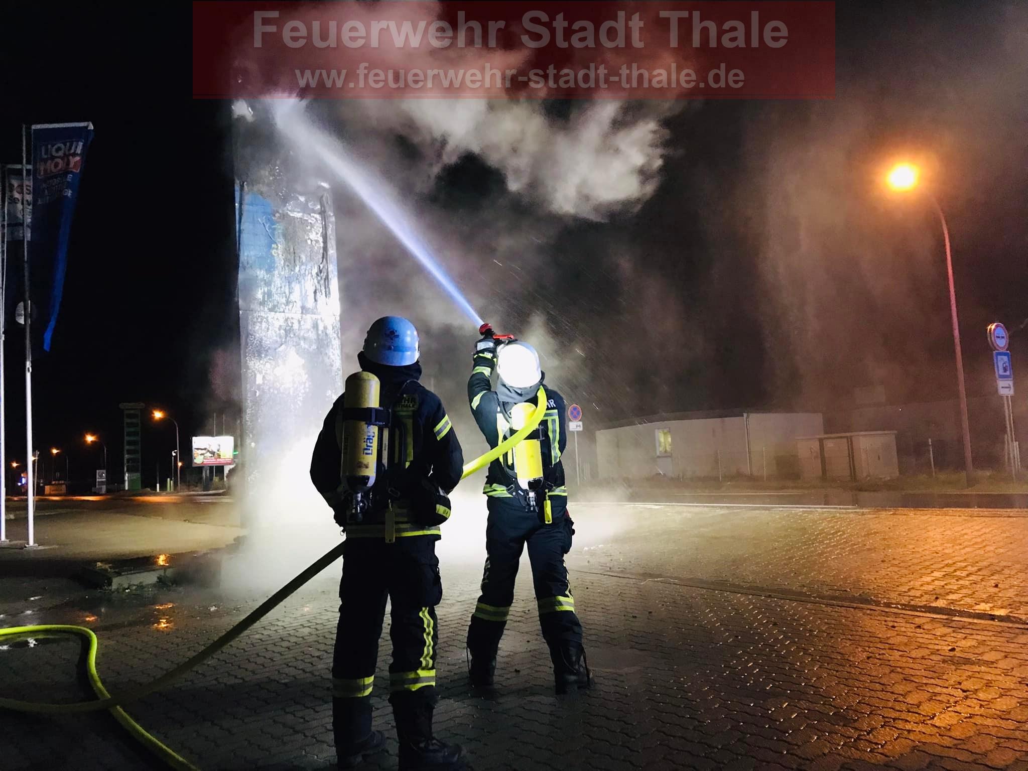 satzkräfte stand die Werbetafel eines Autoshauses in Vollbrand. Mittels Schnellangriff ging ein Trupp unter Atemschutz zur Brandbekämpfung vor. Nach einer abschließenden Kontrolle mit der Wärmebildkamera konnte die Einsatzstelle an die Polizei übergeben werden.Noch am Einsatzort wurde die Ortsfeuerwehr Thale durch die Leitstelle zu einem Folgeeinsatz alarmiert.