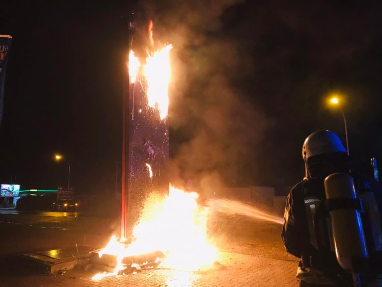satzkräfte stand die Werbetafel eines Autoshauses in Vollbrand. Mittels Schnellangriff ging ein Trupp unter Atemschutz zur Brandbekämpfung vor. Nach einer abschließenden Kontrolle mit der Wärmebildkamera konnte die Einsatzstelle an die Polizei übergeben werden.