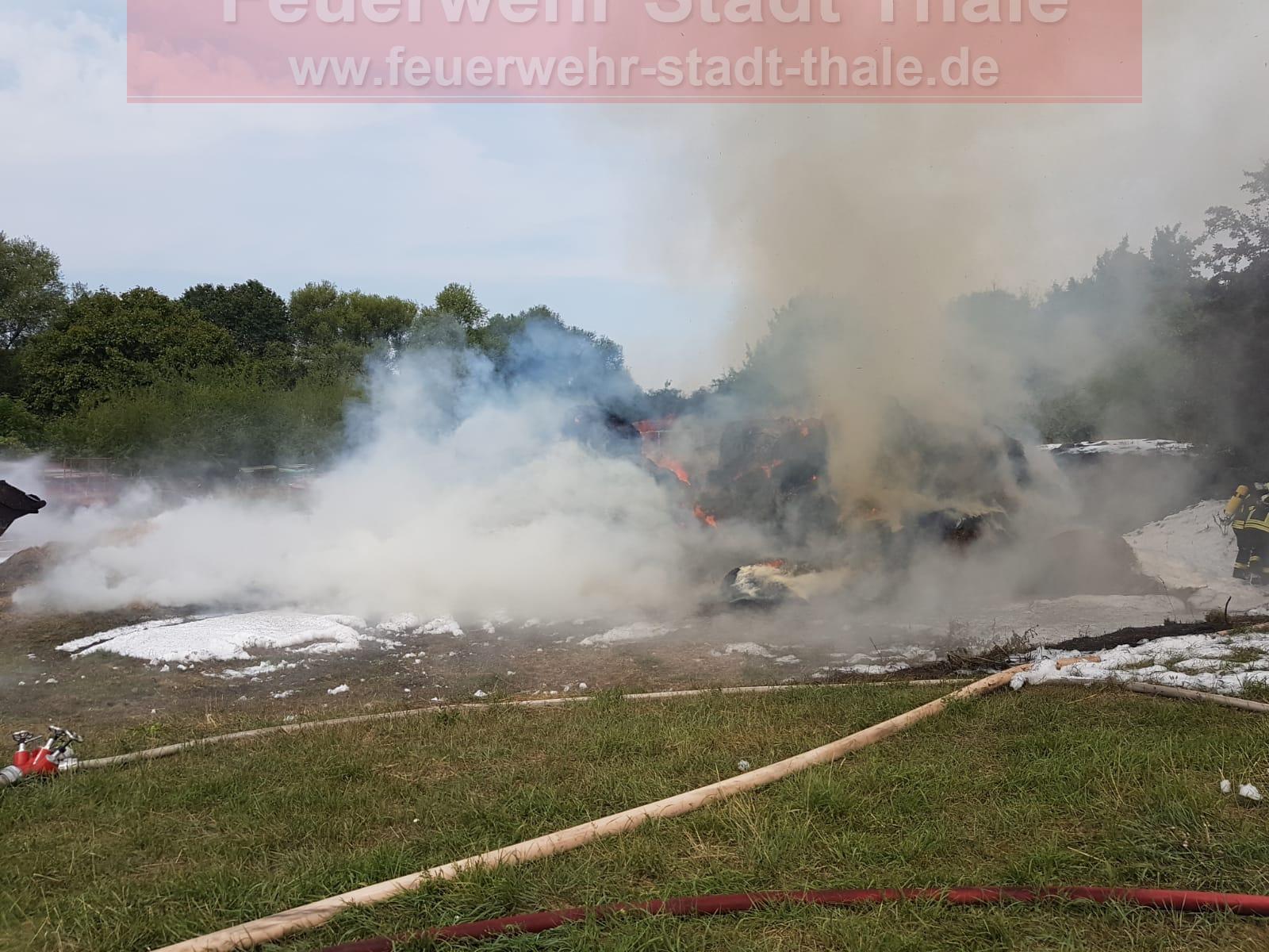 Eine genauere Lageerkundung ergab einen Stroh- & Heuballenbrand an der Ortsumgehung in Höhe der Abfahrt Neinstedt. Dort standen insgesamt rund 80 Ballen im Vollbrand. Als erstes wurde eine Riegelstellung zum angrenzenden Wald aufgebaut, um ein Übergreifen zu verhindern. Zeitgleich wurde eine Löschwasserentnahmestelle im Bereich Heizhaus Neinstedt aufgebaut, um mittels Pendelverkehr die Löschwasserversorgung sicherzustellen. Zusätzlich wurden die Wasserkaupen der Agrargesellschaften Warnstedt und Timmenrode zur Einsatzstelle beordert.