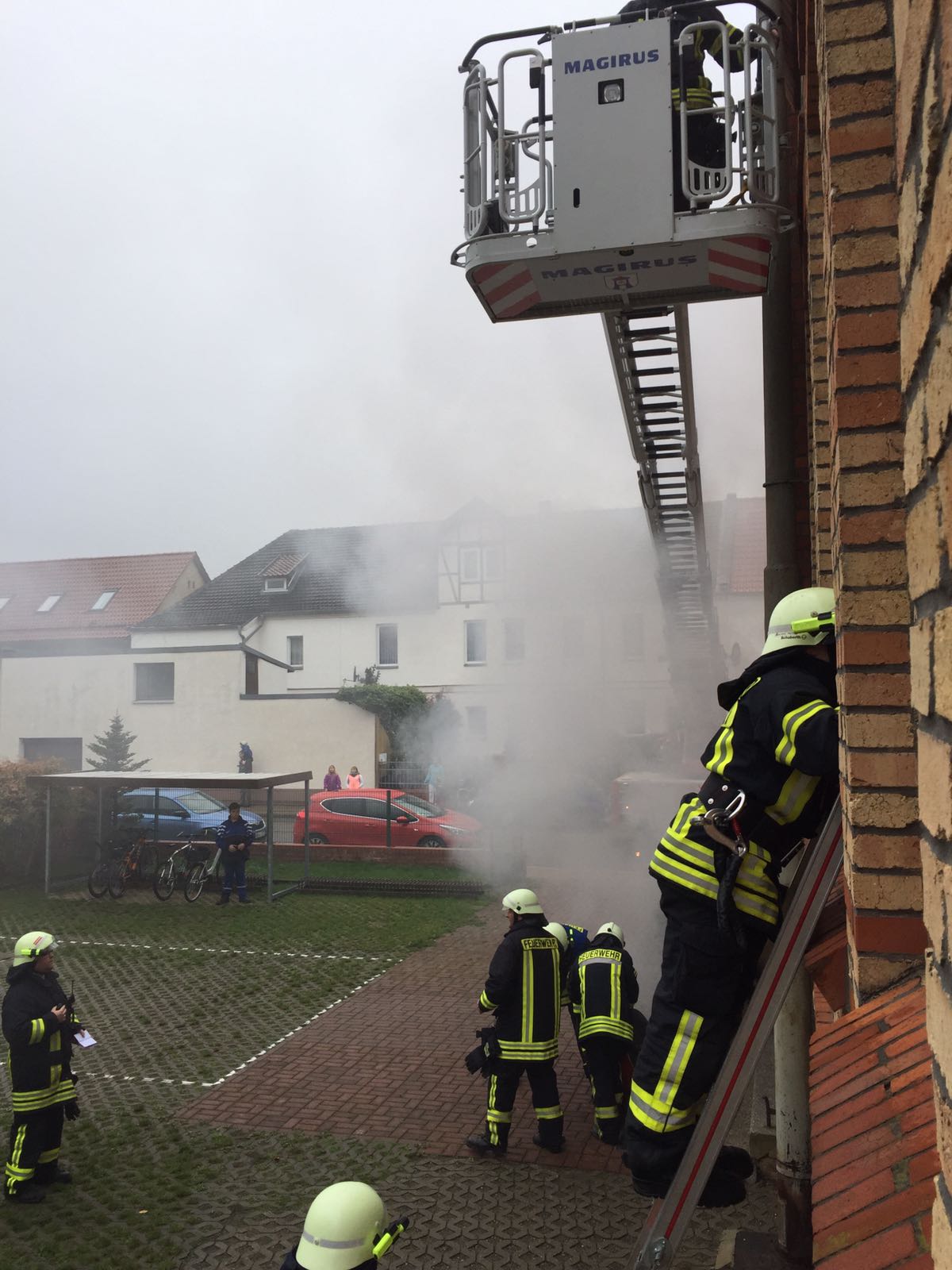 Vor Ort angekommen waren die Kameraden aus Thale und Neinstedt bereits dabei, ihre Atemschutzgeräteträger auszurüsten um zur Menschenrettung und Personensuche vorzugehen. Zeitgleich wurde bereits auch die Drehleiter zur Menschenrettung in Stellung gebracht.