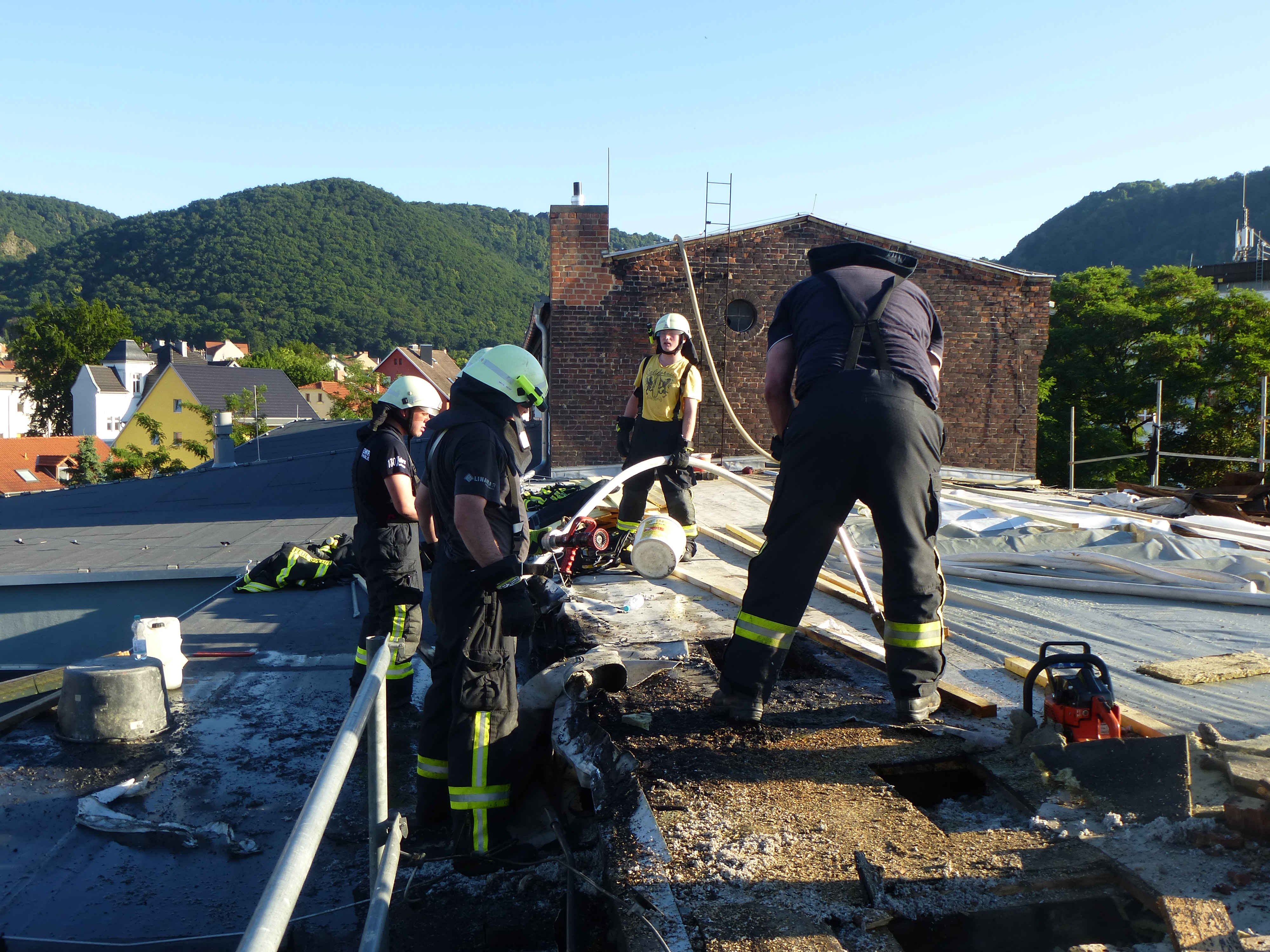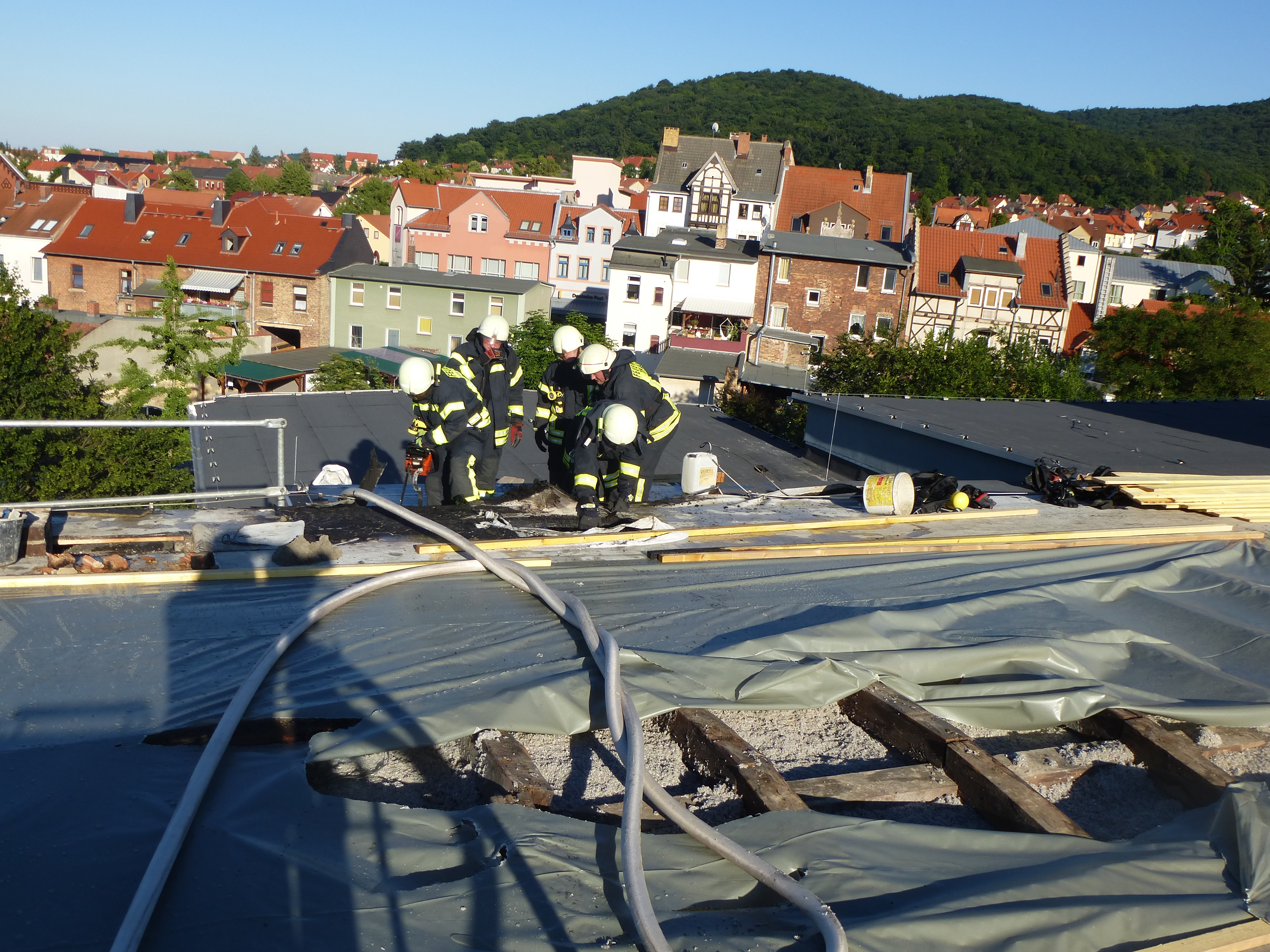 Nach Eintreffen der Dachdeckerfirma musste diese den betroffenen Dachbereich öffnen, alle Glutnester wurden mit einem C-Rohr abgelöscht.