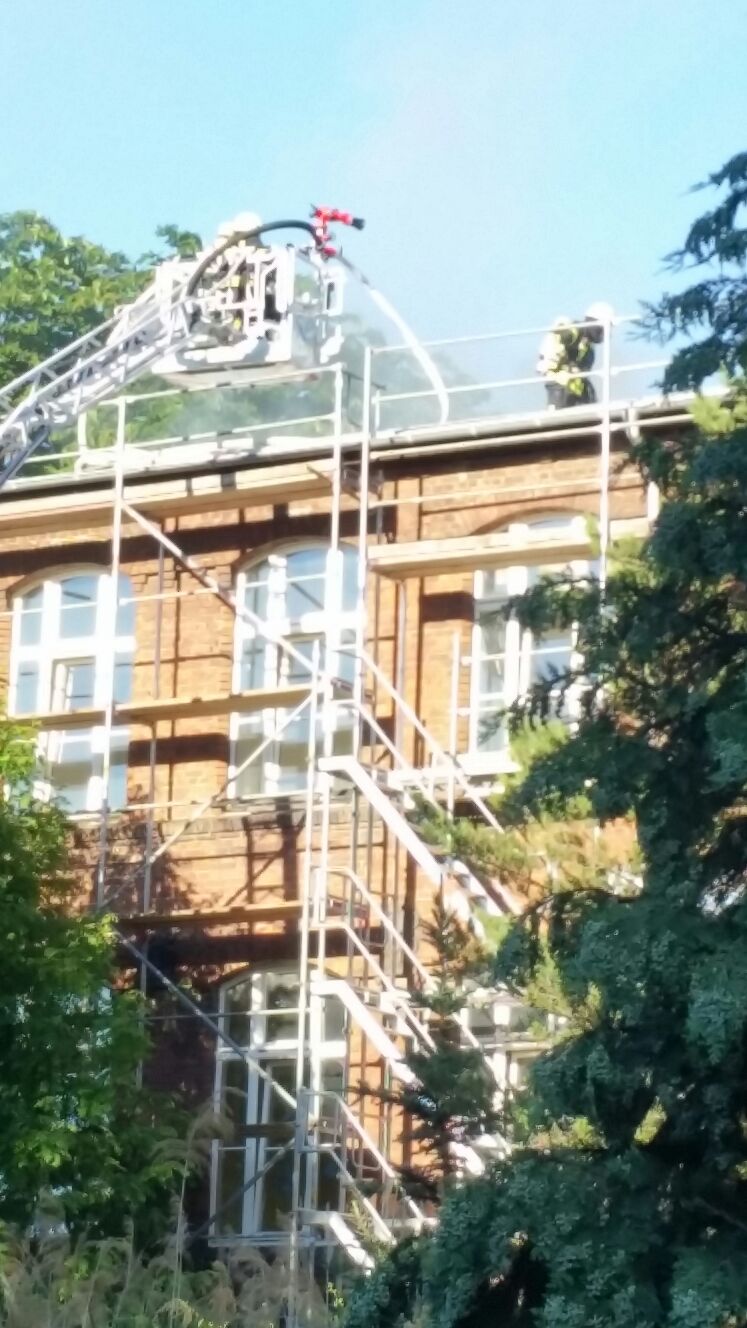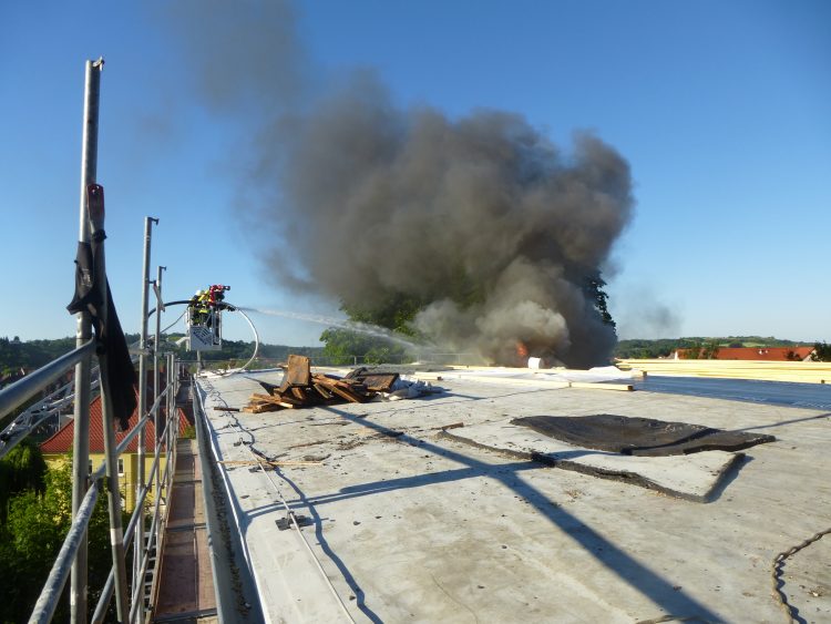 Der Zugang zum Brandereignis war erst nach dem Aufnehmen der Dachhaut möglich. Das Feuer konnte mittels Drehleitereinsatz unter Kontrolle gebracht werden.