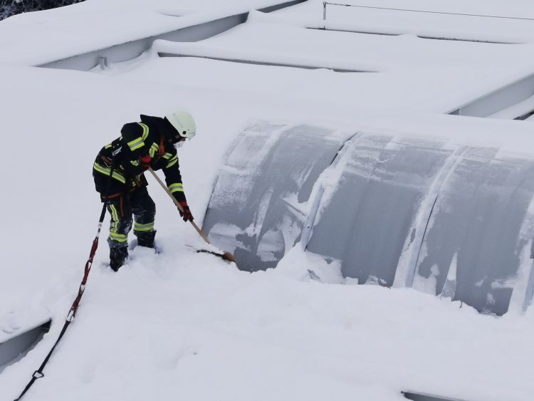 Die Kameraden haben mittels Drehleiter die Lageerkundung und dann die Schneeberäumung durchgeführt, im weiteren Einsatzverlauf konnten die Kameraden, ausgestattet mit einer Absturzsicherung, das Dach betreten und die Schneeräumung fortführen.