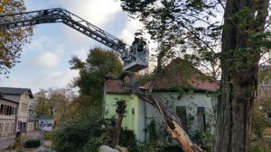 Der Aufgaben der Technischen Hilfe gingen vom Sägen der Bäume, dem Räumen der Einsatzstellen mit Fahrzeugwinden oder dem Einsatz eines Mehrzweckzuges, auch der unterstützende Einsatz der Drehleiter war mehrfach gefordert.