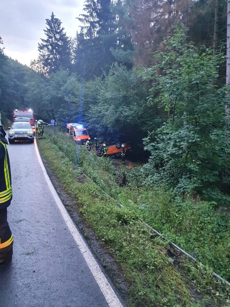 Vor Ort war ein PKW alleinbeteiligt verunfallt und auf dem Dach liegend im Straßengraben vorgefunden. Beim Eintreffen war der  Fahrer bereits aus dem Auto heraus und wurde durch den Rettungsdienst versorgt.