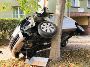 Nach der Unfallaufnahme durch die Polizei konnte der Pkw vom HLF 10 mithilfe eines Seils in die Waagerechte gezogen werden. Anschließend musste der im Baum verkeilte Teil des Kotflügels mittels hydraulischem Rettungsgerät aufgespreizt werden, um eine Aufnahme des Pkw durch den Abschleppdienst zu gewährleisten.