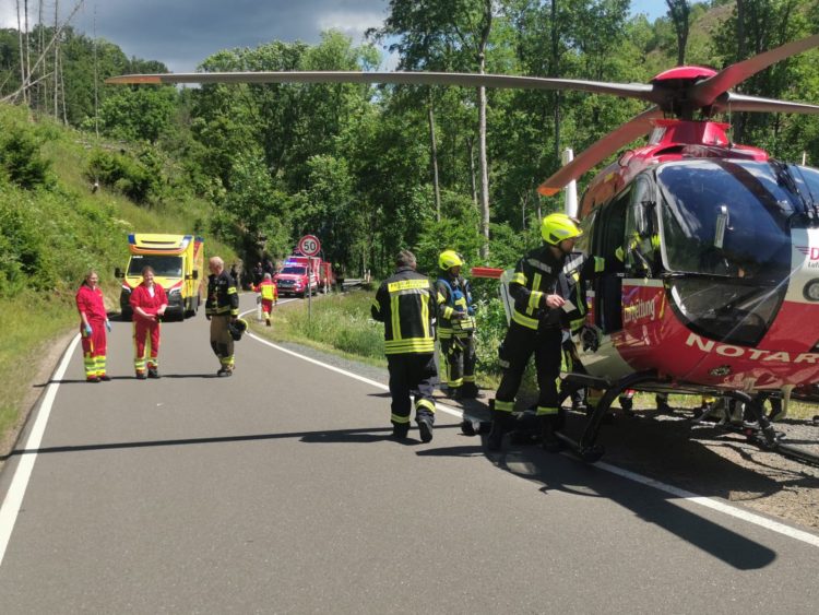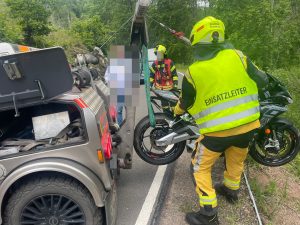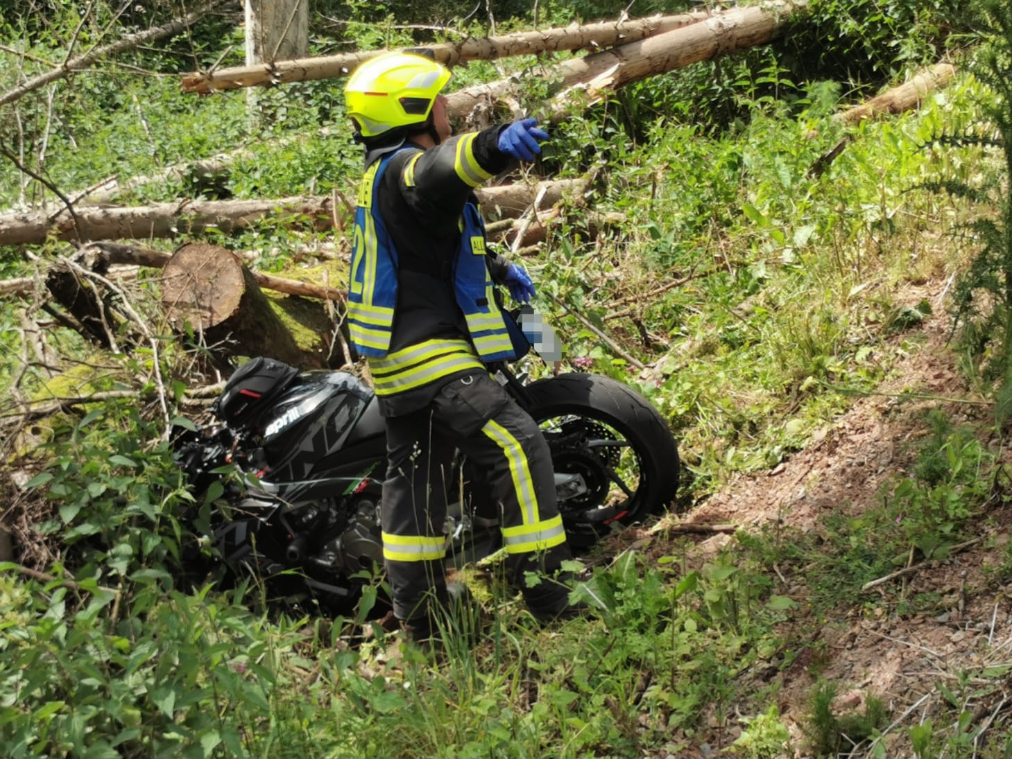Ein Motorradfahrer kam alleinbeteiligt von der Straße ab und kam unterhalb der Straße unter einem Baum zum Liegen. Beim eintreffen der ersten Einsatzkräfte hatten Ersthelfer bereits mit ersten Hilfsmaßnahmen begonnen. Die Einsatzkräfte der Feuerwehr sicherten die Einsatzstelle ab und unterstützten bei der Patientenversorgung. Anschließend wurde die verletzte Person mittels Spineboard und Manpower zur weiteren Versorgung in einen Rettungswagen gebracht. Danach unterstützten die Kameradinnen und Kameraden beim Patiententransport zum Rettungshubschrauber.