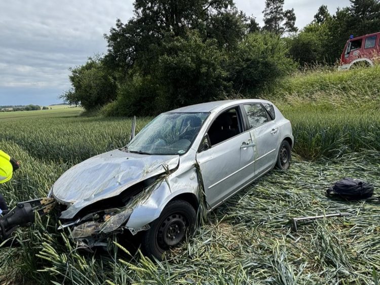 Vor Ort ist ein Pkw alleinbeteiligt von der Fahrbahn abgekommen, hat sich überschlagen und ist anschließend auf den Räder stehend auf einem Feld zum Stehen gekommen.