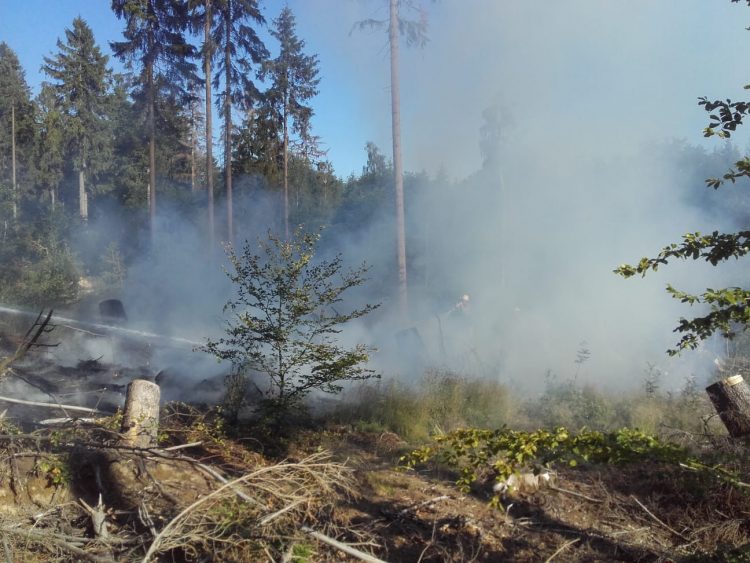 Diesmal brannten am Bergrat Müller Teich ca. 100 qm Waldfläche. Der Vollbrand wurden mit dem Einsatz von mehreren C-Rohren bekämpft und die Ausbreitung verhindert. Abschließend erfolgte die Ablöschung der Fläche.