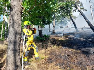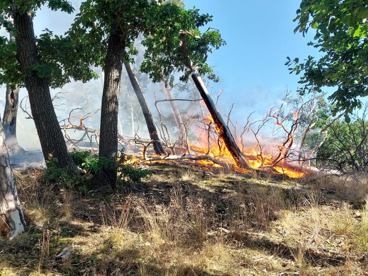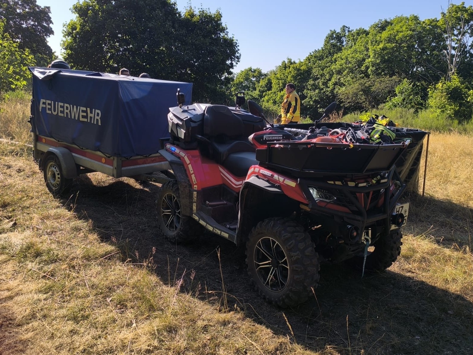 Die Lageerkundung der erst eintreffenden Kameradinnen und Kameraden ergab einen sich rasch ausbreitenden Vegetationsbrand auf dem Lindenberg. Daher wurden weitere Einsatzkräfte aus Westerhausen, Neinstedt, Stecklenberg, Gernrode und Timmenrode sowie der TLF Zug Ost, das Löschflugzeug „Hexe 1“ und das THW alarmiert. Das THW und die Feuerwehr Gernrode unterstützte uns mit ihrer gut ausgestatteten und ausgebildeten Drohnenstaffel.