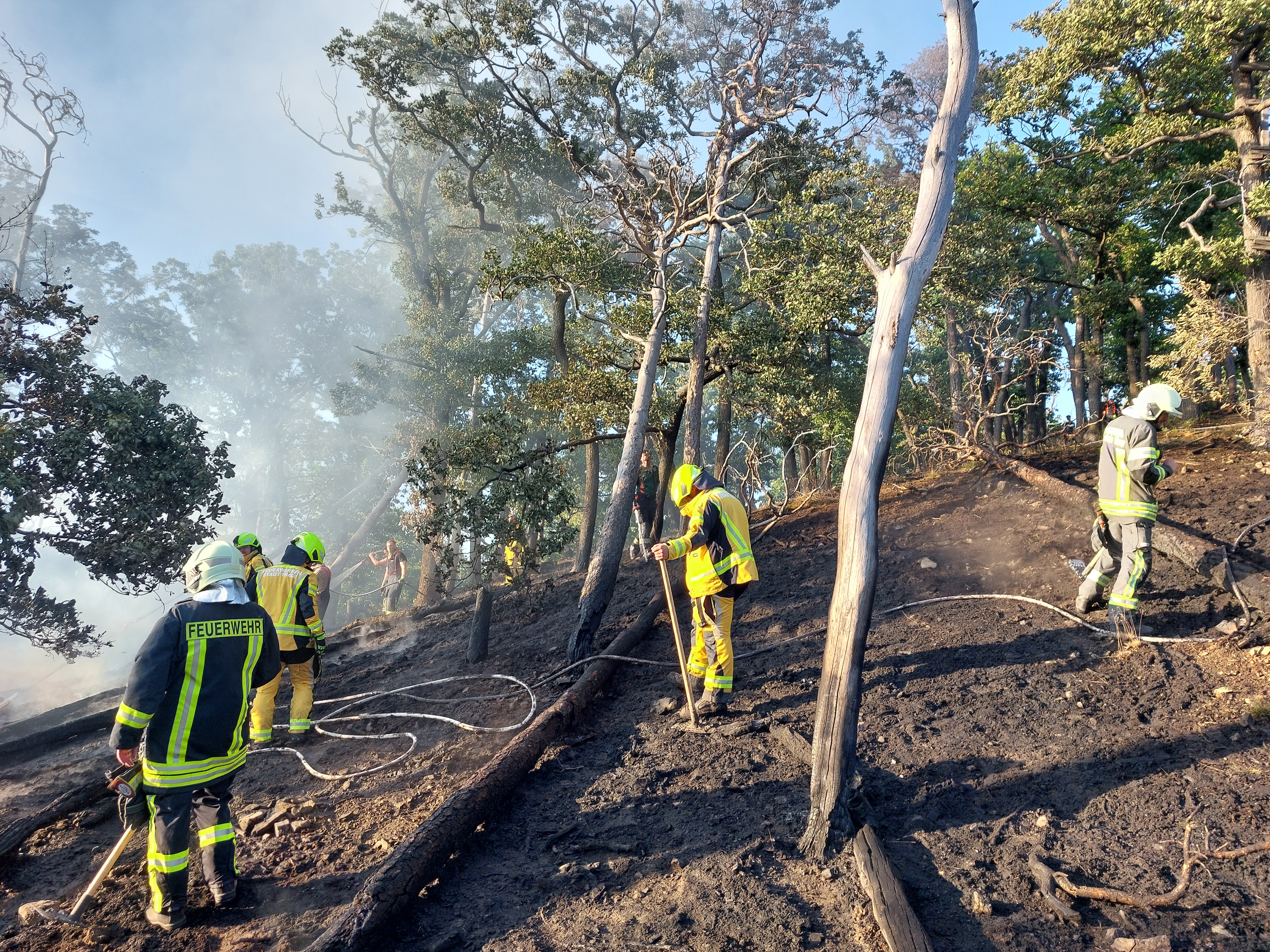 Trotz der erschwerten Bedingungen zeigten die weiteren Löschmaßnahmen weiterhin Wirkung, sodass der Einsatzleiter um 20:45 Uhr „Feuer aus“ melden konnte. Im Anschluss wurden die letzten Glutnester durch das Bodenpersonal abgelöscht. Parallel wurde die FTZ Harz zum Einsatz hinzugezogen und ein Austausch der eingesetzten Schläuche organisiert. Nach den ersten Nachlöscharbeiten konnte gegen 23:45 Uhr die Brandstelle an die Forstverwaltung übergeben werden, die mit Löschrucksäcken der Feuerwehr eine Brandwache sicherstellten.